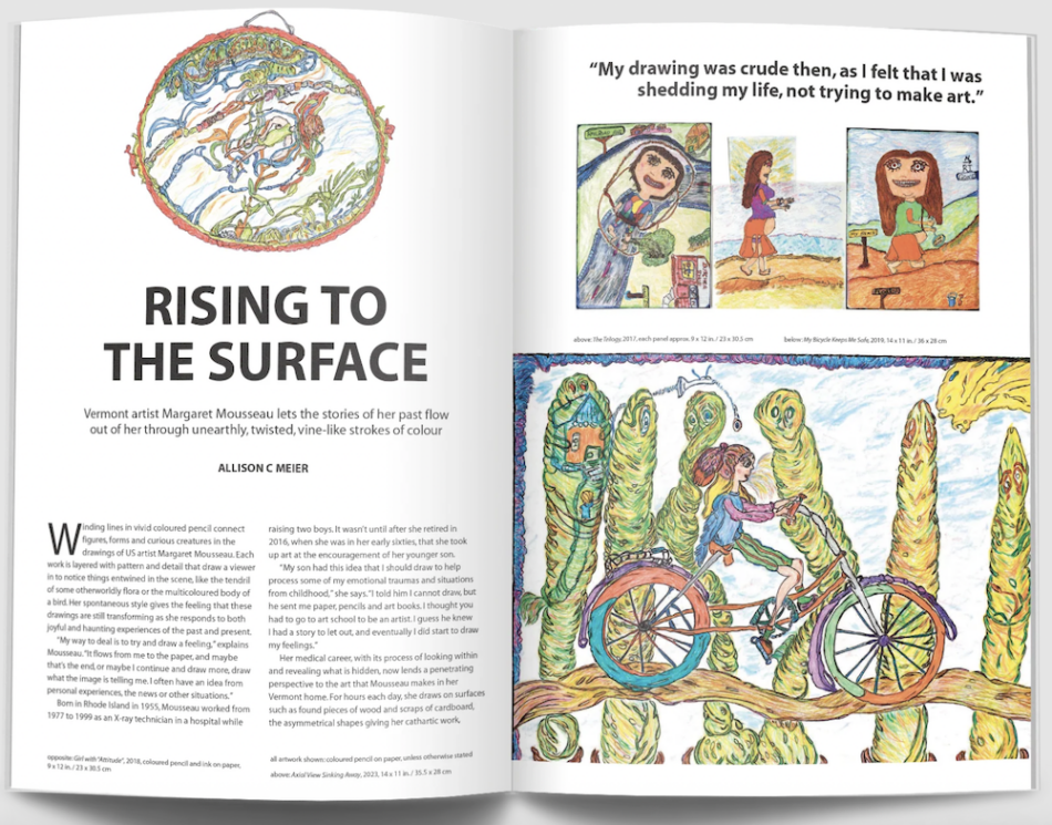 The spring 2026 issue of Raw Vision magazine includes my feature on artist Margaret Mousseau, a self-taught artist who uses intricate colored pencil drawings to reflect on her life. You can find the full piece in the print issue and read an excerpt online: